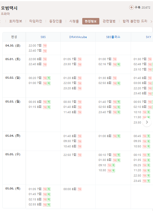 각 채널별로 재방송하는 시간이 나오게 됩니다.