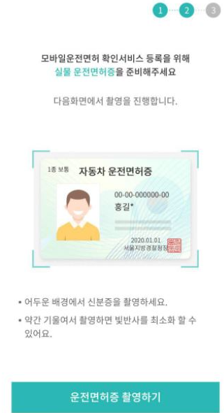 - 모바일 운전면허 확인 등록을 위해 실물 운전면허증을 인증합니다.