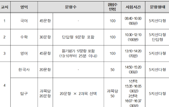 출제영역, 문항 수 등을 알아볼 수 있습니다.