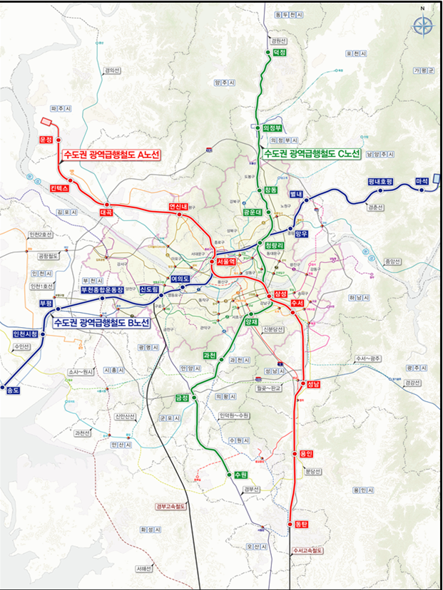 GTX노선도는 경기도와 서울을 이어주는 '수도권 광역 급행 철도'입니다.
