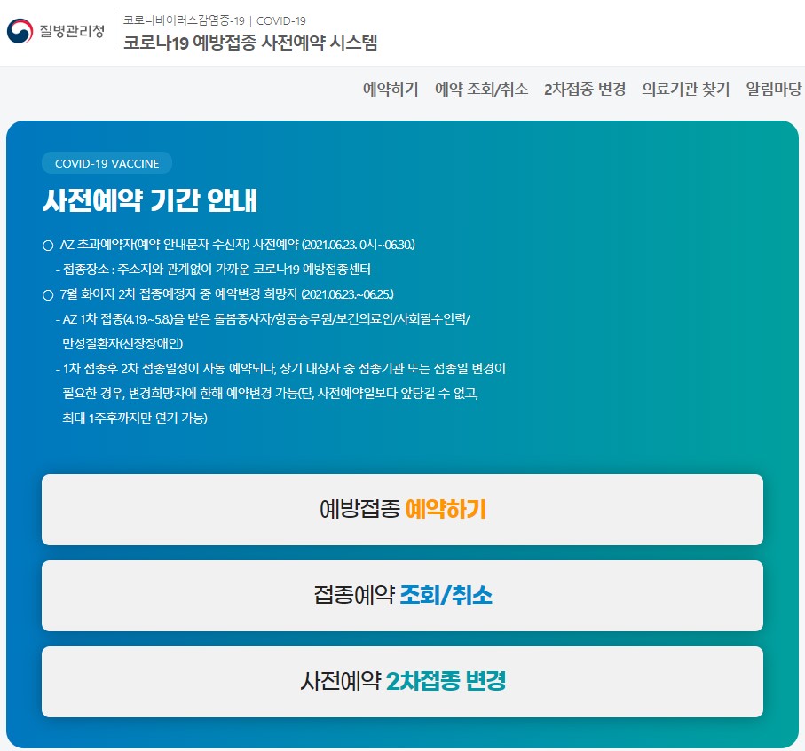 위 사진은 질병관리청 코로나19 예방접종 사전예약 시스템 메인 화면입니다.