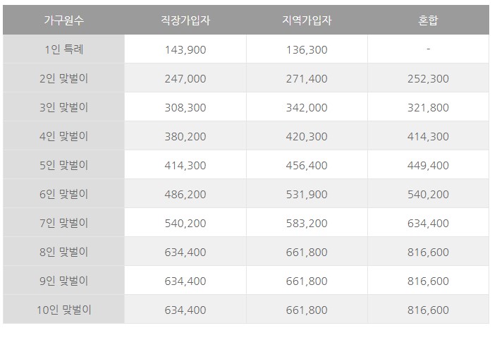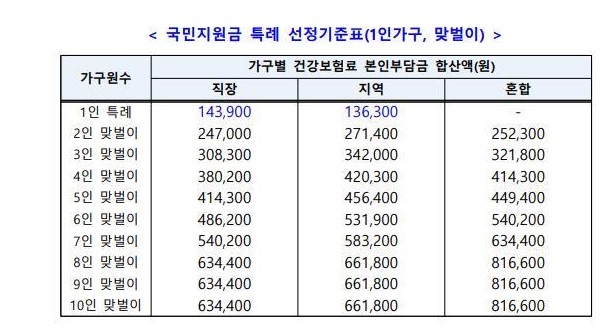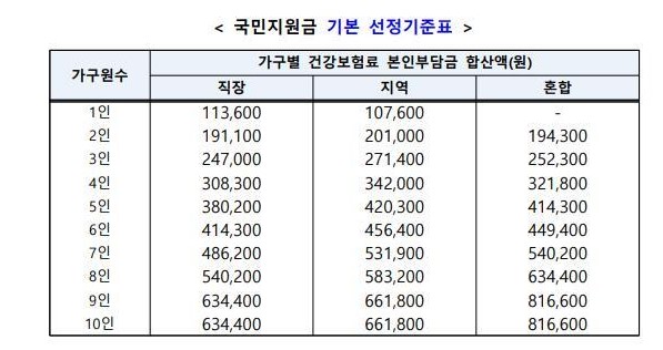 선성기준표에 가구별 건강보험료 합산액이 아래 기본 표와 동일합니다.