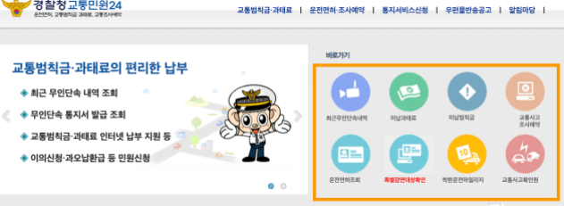 해당 경찰청 교통민원 24의 메인 화면에 있는 "바로가기"를 보시면