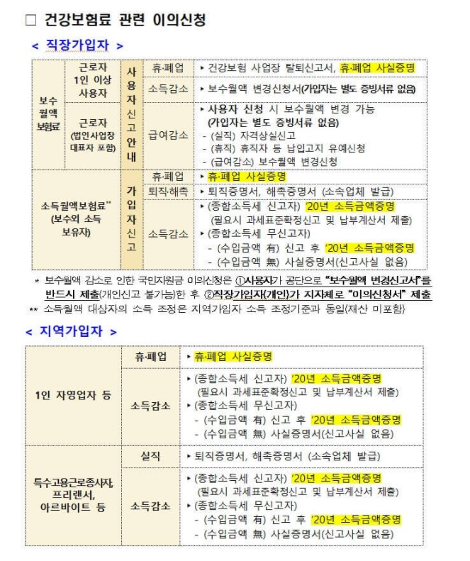 직장가입자,지역가입자의 보험료조정관련 준비서류입니다.
