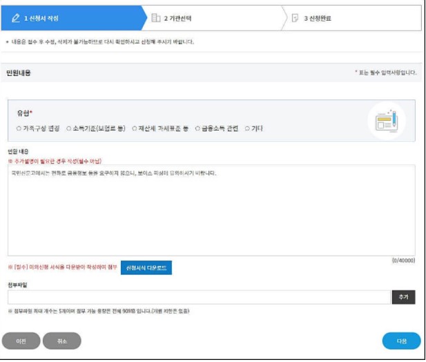 이의신청 사유를 선택하고 민원내용을 설명해야하며,