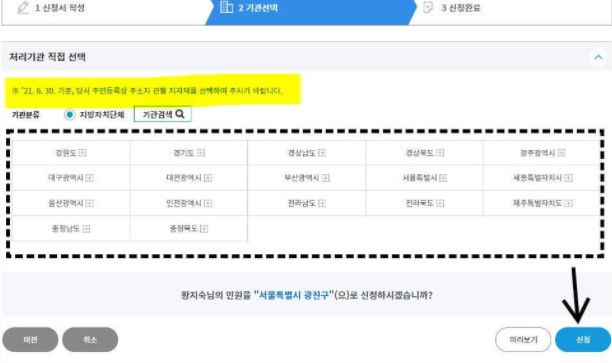 2021,6,30일 기준 당시 주민등록상 주소지 관할 지자체를 처리기관으로 선택하고