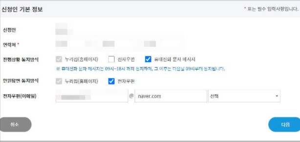 신청인 기본정보와 진행상황,답변 통지방식을 선택한다.