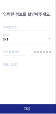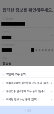 이름 / 주민등록번호 / 통신사 / 휴대폰 번호 > 약관 동의 >