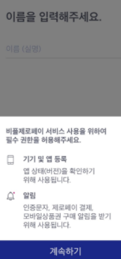 제로페이 가입방법은 사용권한을 허용 여부{계속하기} >