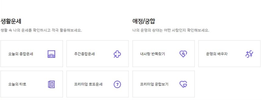 운세서비스를 클릭하면 정통운세를 포함해서 생활운세,애정,궁합 등