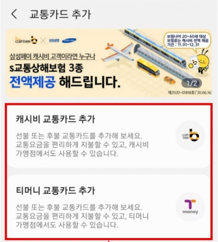 그리고 캐시비, 티머니 교통카드 중 하나를 선택합니다.