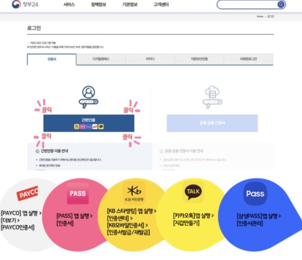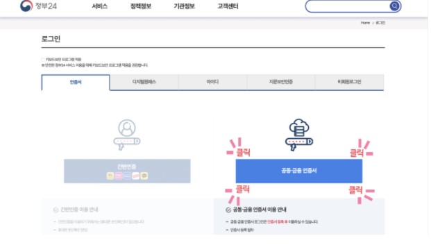 정부24 로그인 페이지 우측에서 공동인증서를 함께 이용할수 있습니다.