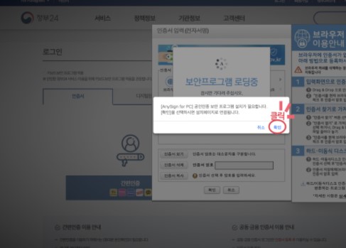 공동인증서 사용을 위해 보안프로그램을 필수로 설치해야 합니다.
