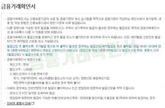 금융거래확인서 인터넷 발급의 발급 수수료는 개인은 면제, 법인은 1,000원이 부과됩니다.