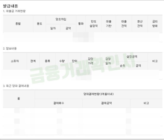 발급내용은 대출금 거래현황과 담보내용,최근 당화 결제내용 등으로 나뉘어 나옵니다.