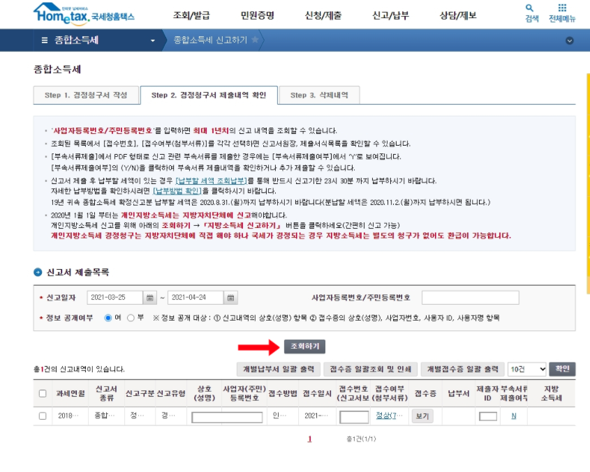 12. 신고서 제출목록 > 조회하기 클릭 후 최종 접수 확인하기