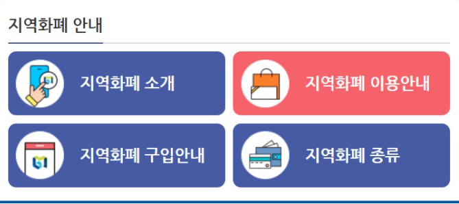 지역화폐 안내 메뉴와 지역화폐 종류가 있습니다.