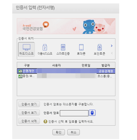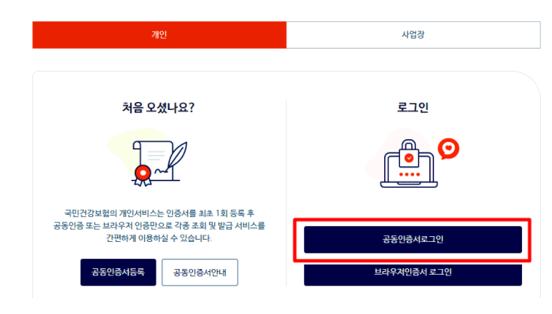 - 본인 확인을 위하여 공동 인증서 로그인이 필요합니다.