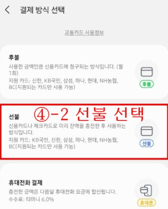 결제방식은 선불을 클릭하고 카드를 선택하면 됩니다.