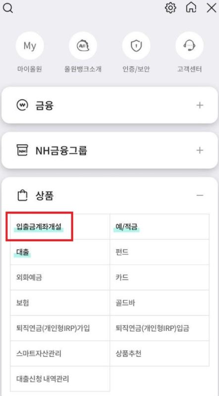 상품 카테고리에 입출금 계좌 개설을 클릭합니다.