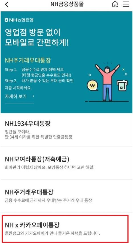 그리고 금융상품에서 NH x 카카오페이 통장을 클릭해서