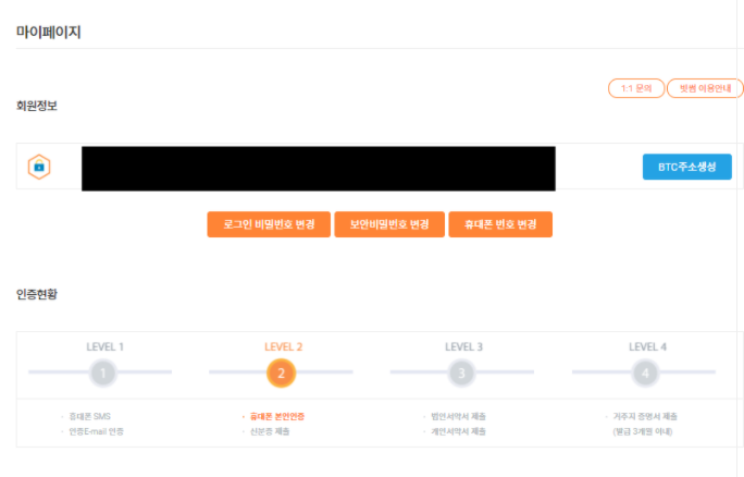 빗썸에서는 회원가입 후 인증에 따라 레벨이 나눠집니다.