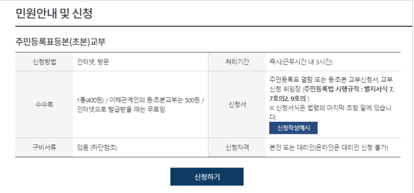 (민원안내 및 신청)으로 가시면 세부적인 내용을 확인할 수 있는데요.
