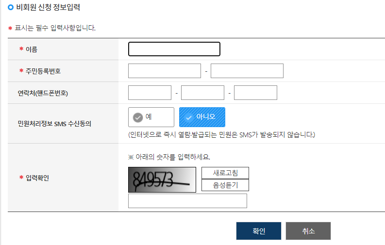 위에 있는 비회원 신청 정보 입력을 다 해주신 후